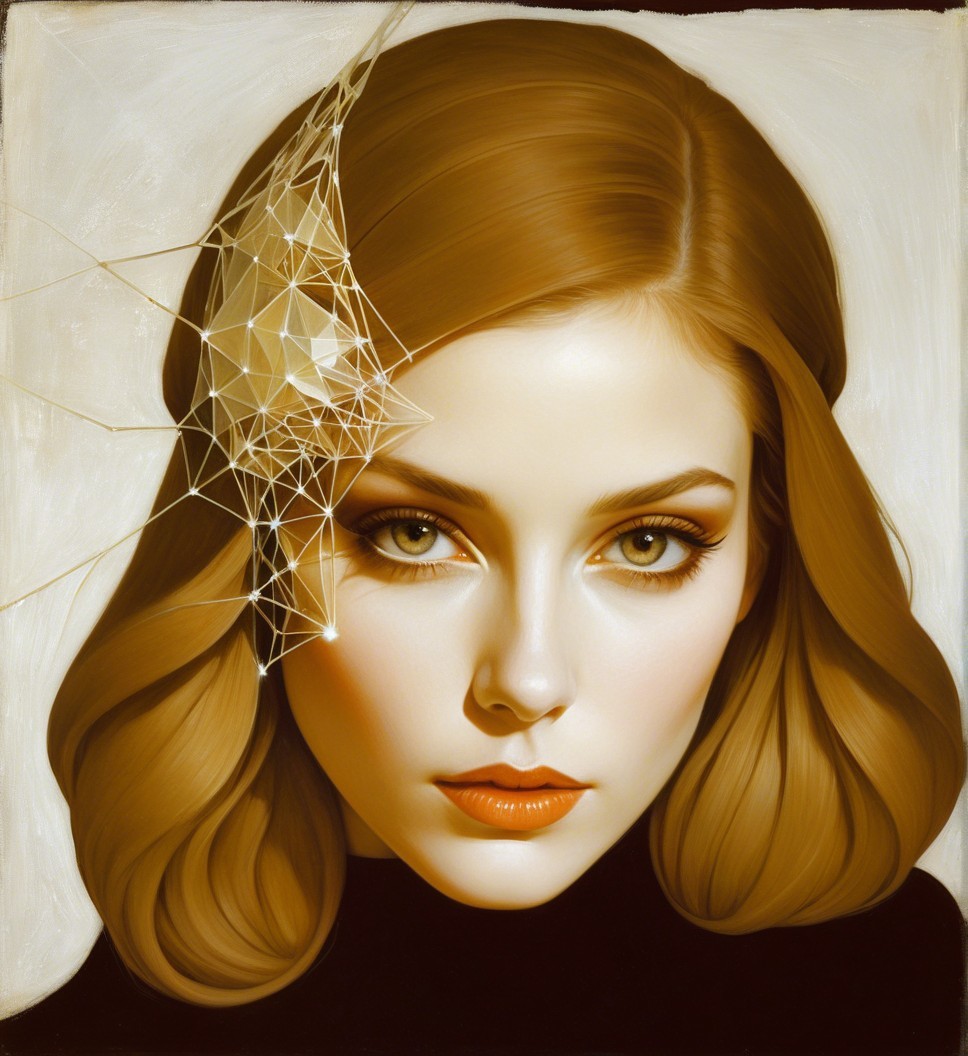 Prompt: Ethereal headshot portrait, enchantress, intricately detailed neuronal network that emerges from the hairline , blending style of brad Kunkle, Overton Loyd, barclay shaw and david graeme Baker, digital painting, layers convey facial and bioluminescent elements, extremely detailed bioluminescent elements, vaporous lighting accentuating beauty and attraction, abstract geometrical, filigree ,fibre touches, inspired by Georgia o'keffee, dethereal atmosphere. Iris van Herpen's Hypnosis collection influence, retrofuturistic setting, hybrid fabrics, fantasy details in style of Curtis Cole, Michael Whelan and Alex Alemany, dark fantasy inspiration, dethereal, triadic color scheme beige grey yellow, crisp quality, grey to yellow palette, stylized with concept art, collaborative styles of Margaret Keane and Geof Darrow, Paul Cadden's hallucinatory influence, hues of William Turner and Arlie Opal, coherent, concept fusion, hyper-realistic quality, 16k UHD resolution, dramatic lighting synthesis by Overton Loyd, anisotropic filtering 1.7, colorful iridescence 0.7, ambient occlusion 1.5, dynamic lighting 1.7 by William Turner,