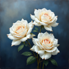 A stunning composition of soft, white and peach roses, blooming gracefully against a deep blue background. Rich green leaves accentuate the flowers' vibrant beauty and delicate details.