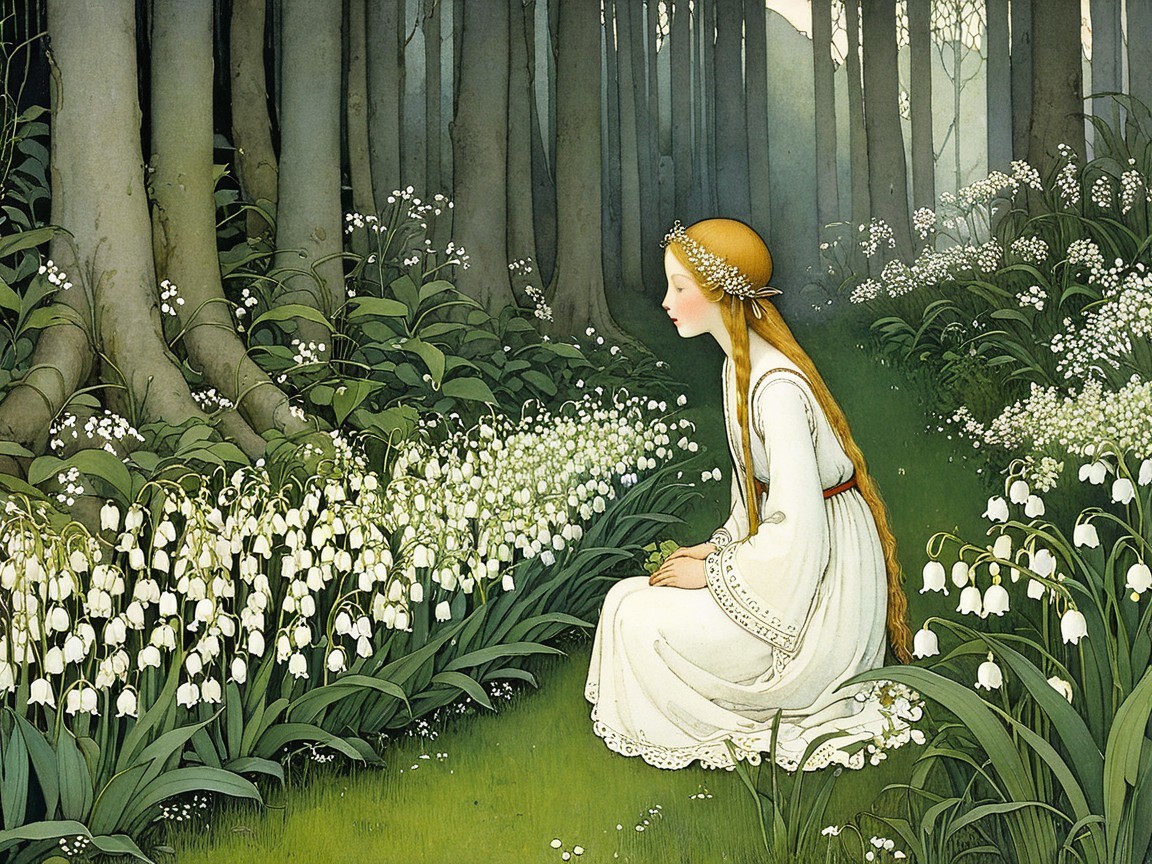 A serene woman with long, flowing hair sits in a lush forest, surrounded by blooming white flowers. The tranquil scene reflects a sense of peace and connection with nature.