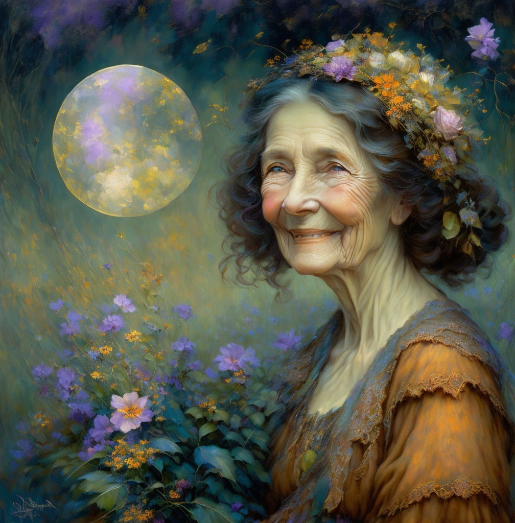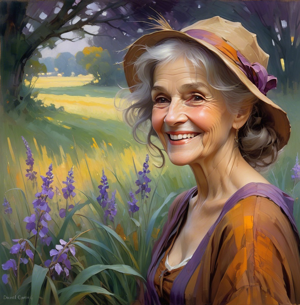 A smiling elderly woman with flowing gray hair wears a large straw hat adorned with purple ribbons. She stands in a vibrant field of irises, exuding warmth and joy.