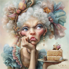 A cheerful elderly woman with graceful silver hair and a pink bow joyfully holds a cake adorned with cherries. Her playful expression captures the essence of celebration and sweetness.