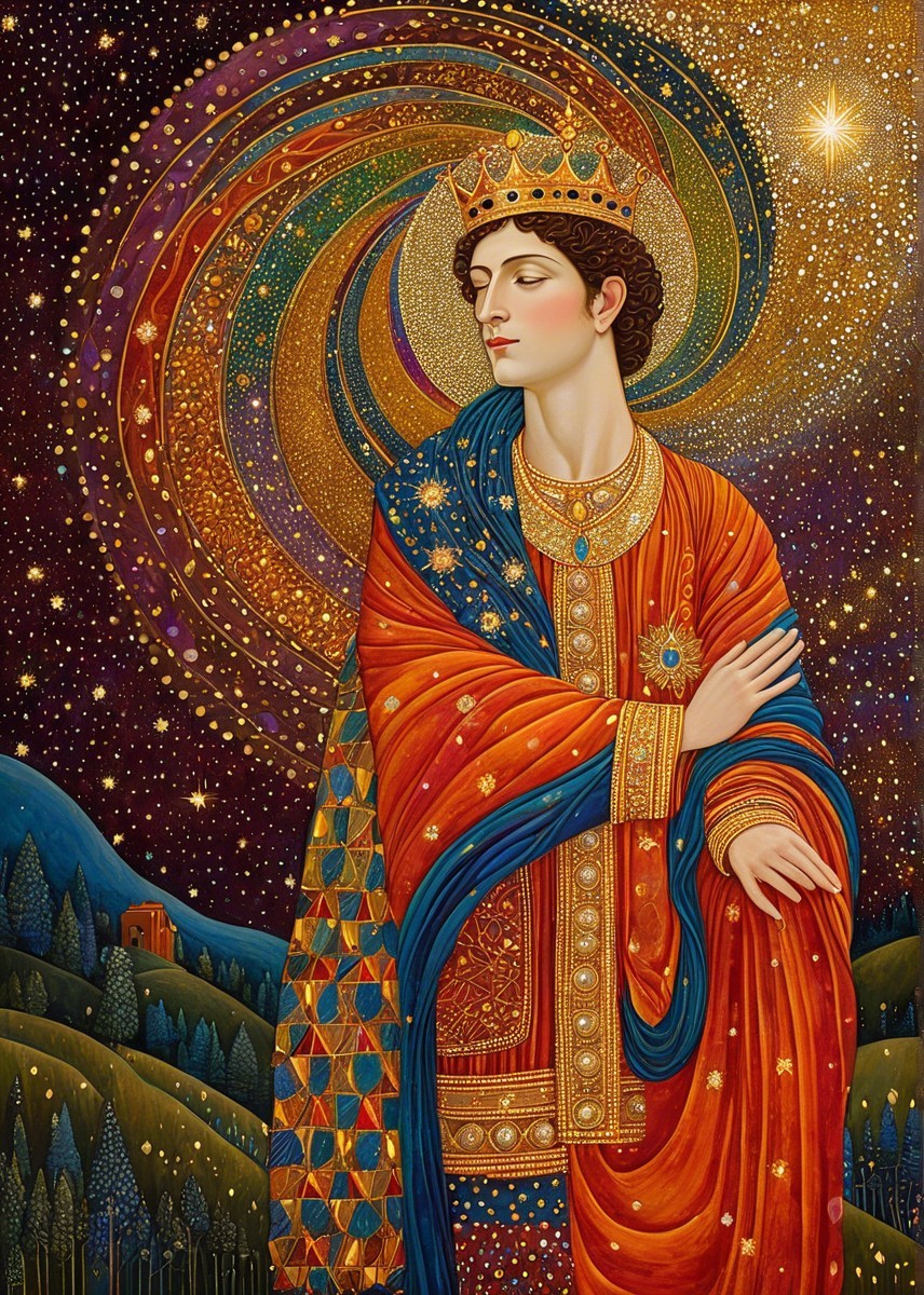 A figure with flowing red hair stands gracefully, adorned in a richly embroidered robe of red and blue. Starry skies and a bright celestial body illuminate the serene, dreamlike scene.