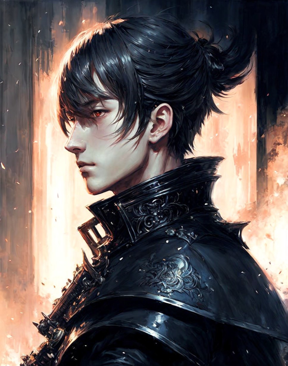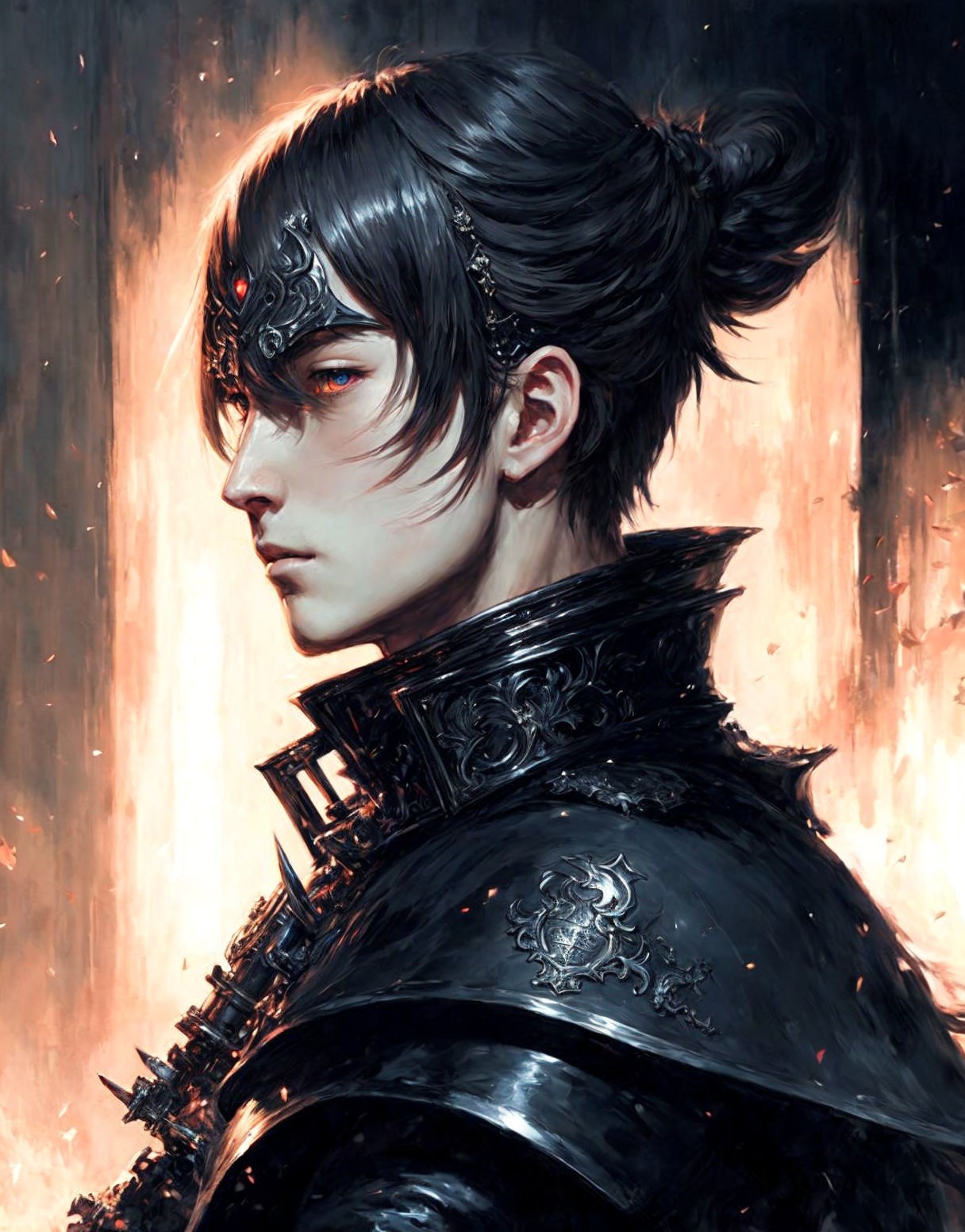 Fantasy warrior digital art: stylized black armor & ornate headpiece, intense gaze, fiery