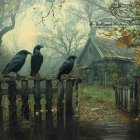 A foggy scene features two black ravens perched on a wooden fence in front of a rustic log cabin surrounded by bare trees, creating an eerie, atmospheric ambiance.