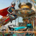 A vibrant, artistic scene featuring two stylish women in colorful sunglasses, adorned with fruit-inspired accessories. One holds a mask, set against a backdrop of stained glass hues.
