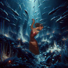 A graceful woman in a flowing gown swims in crystal-clear underwater depths, surrounded by vibrant fish and colorful coral, with beams of sunlight illuminating the serene scene.