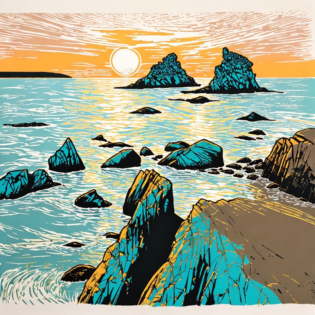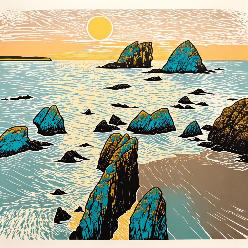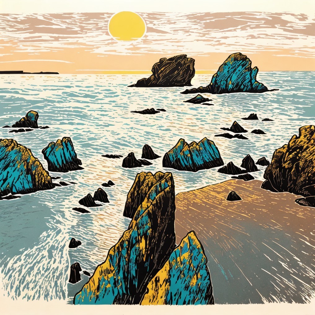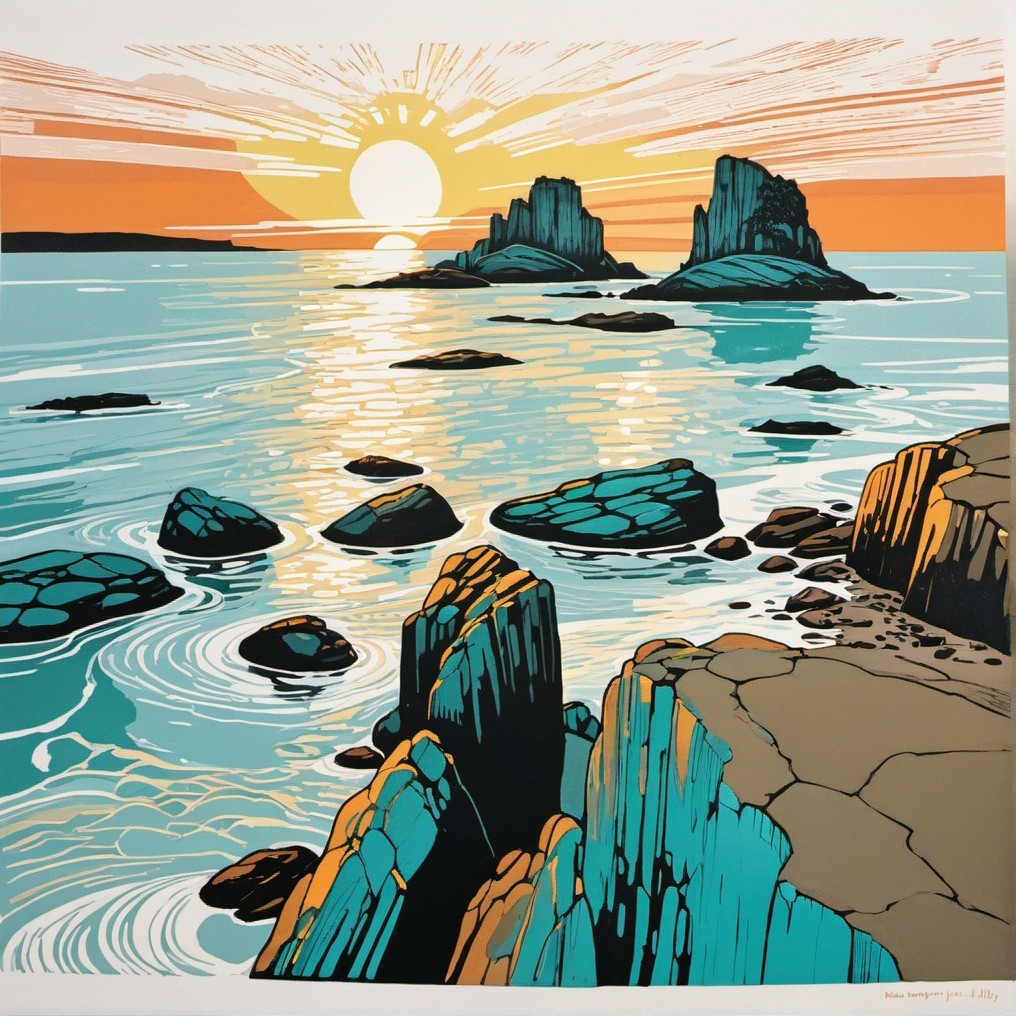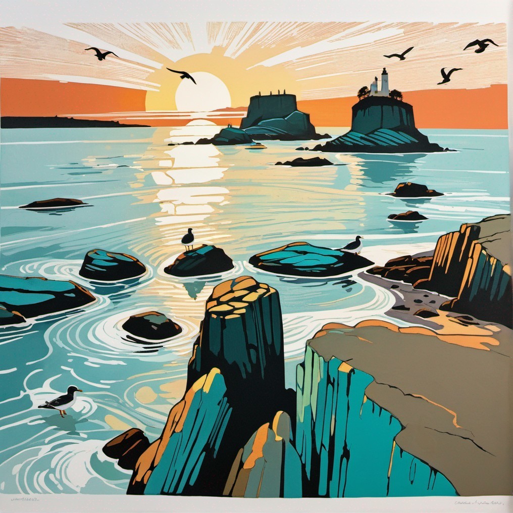 A stylized sunset seascape with birds, reflective water, and silhouetted landforms in the background.