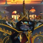 A vibrant, surreal artwork featuring intertwined faces and abstract forms, set against a cosmic backdrop with swirling patterns and luminous orbs, evoking a sense of mystique and connection.