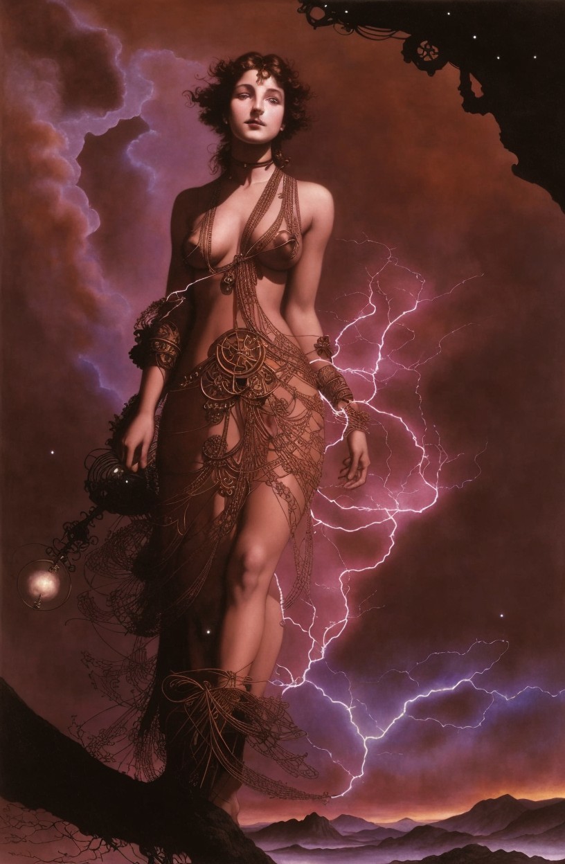 A fantastical figure poses elegantly against a cosmic backdrop, adorned in metallic accessories and flowing fabric, exuding confidence and allure in a dreamlike, surreal atmosphere.