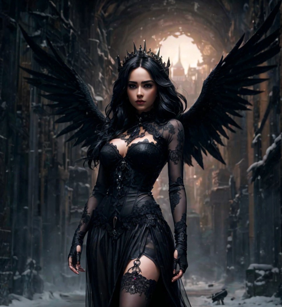 Mysterious Woman with Dark Angel Wings in Snowy Alleyway