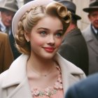A young woman with soft curls and bright blue eyes wears a vintage-style outfit accented with pearls and a delicate hairpiece. She gazes thoughtfully, embodying a classic charm.