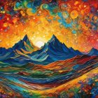 A vibrant landscape features majestic mountains with bold, colorful peaks under a radiant sun. The scene is alive with swirling hues of blue, orange, and green, creating a dynamic, uplifting atmosphere.