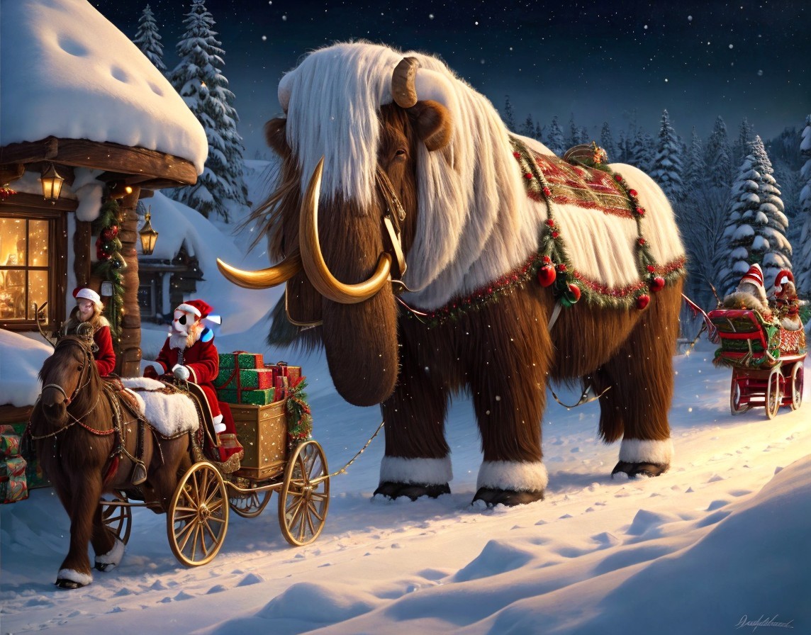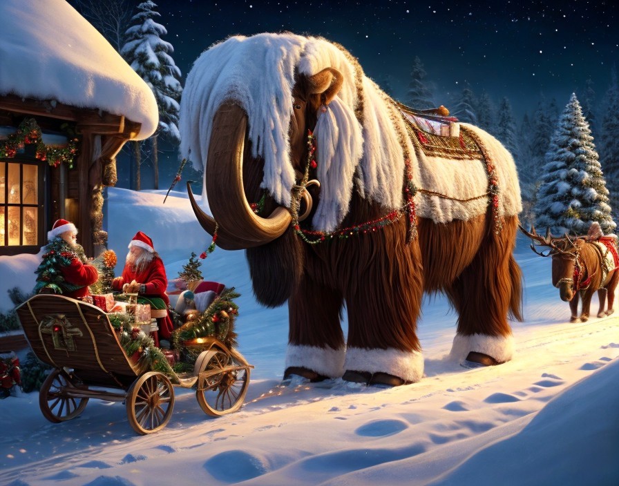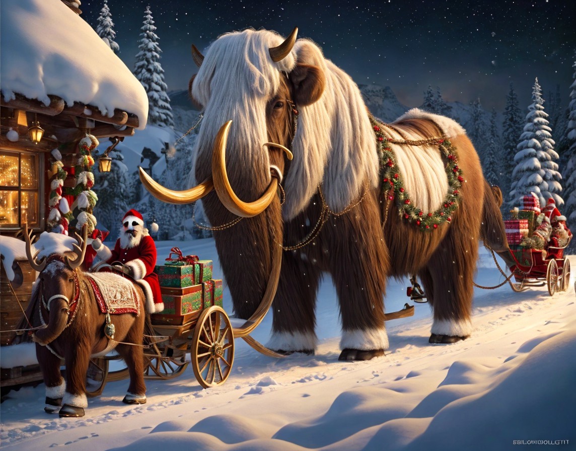 Santa Claus with a decorated wagon pulled by a mammoth in a snowy, festive scene with Christmas lights on a cabin.