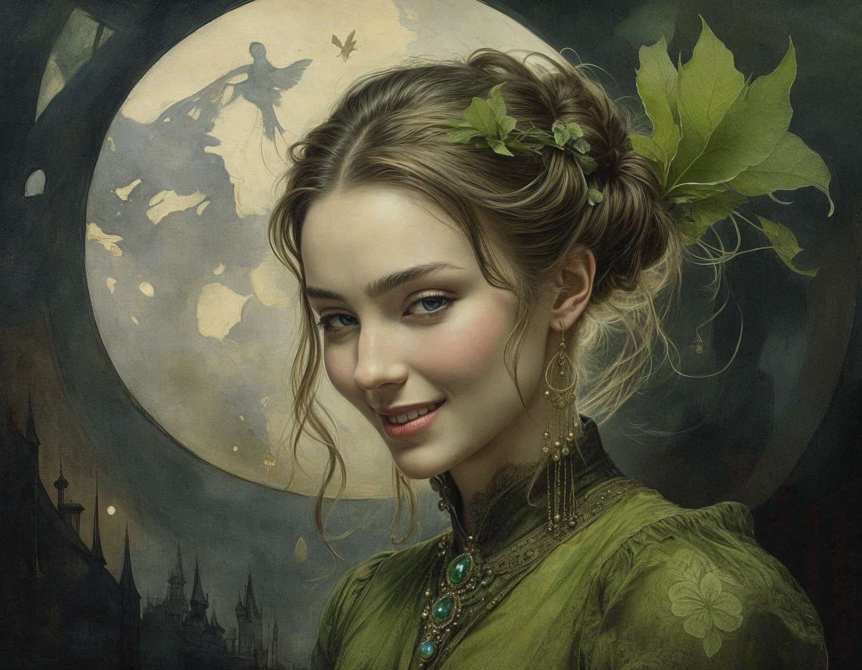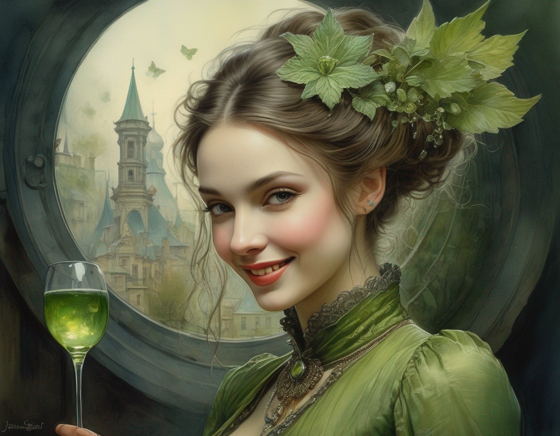Absinthe haze. Beautiful sensual woman feeling so happy, all joy, fun and happines, having a wonderful time, surrounded by all good and lovely things, love, joy and peace, by Jean-Baptiste Monge, watercolor ink, intricate details, fantasy, beautiful, award winning, fantastic view, crisp quality, Peter Gric, Ivan Shishkin, light reflections, vibrant colours, volumetric lighting, polished, masterful surrealism, high definition, crisp quality