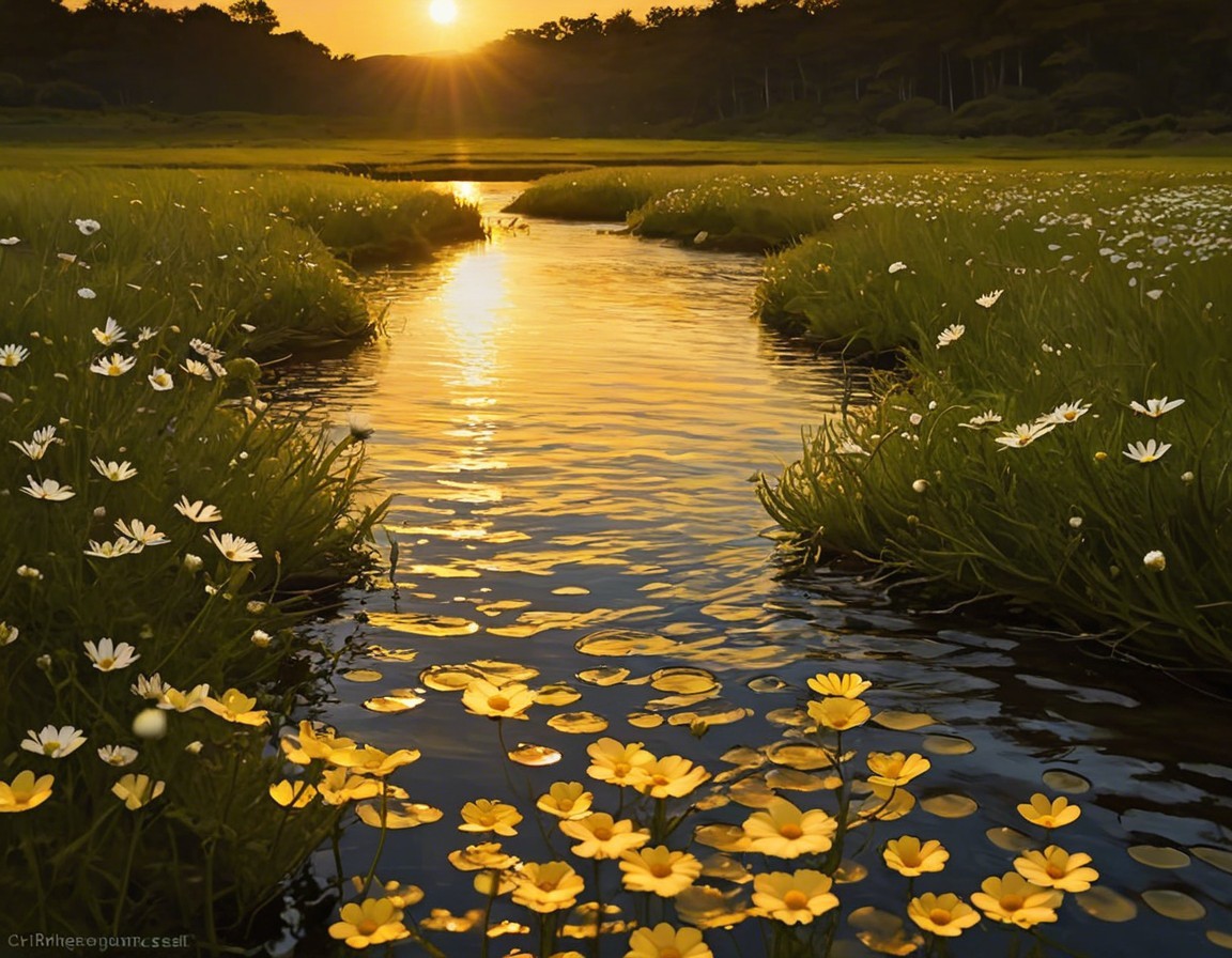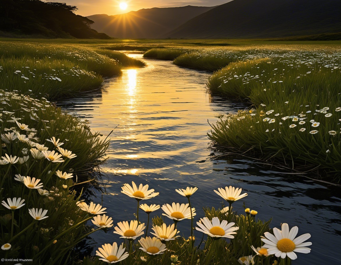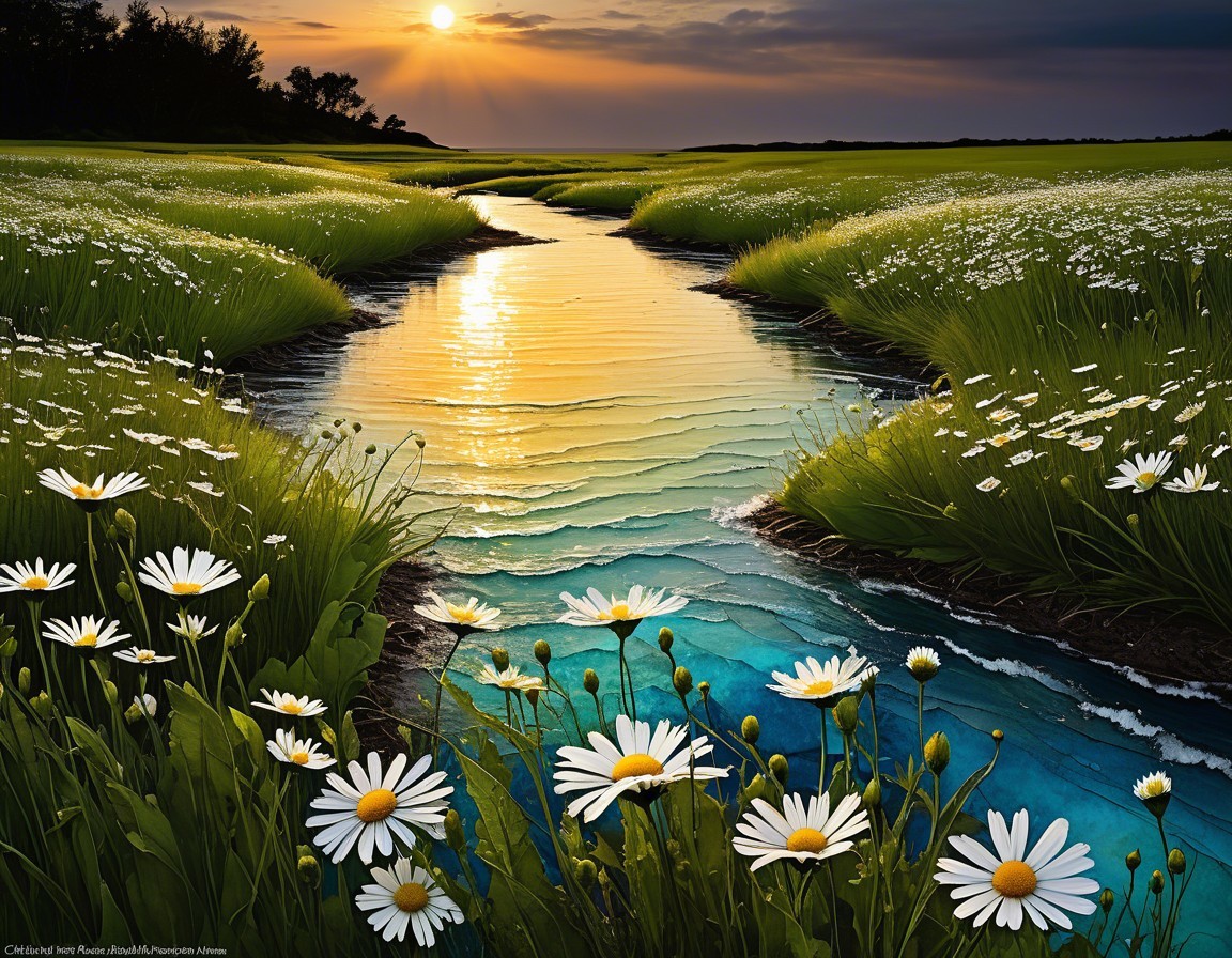 A vibrant sunset reflects on a tranquil stream, surrounded by lush fields and blooming white daisies. The sky is a blend of warm colors, creating a serene and picturesque landscape.