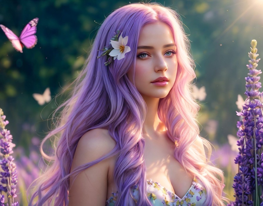 Young Woman in Lavender Field with Butterflies