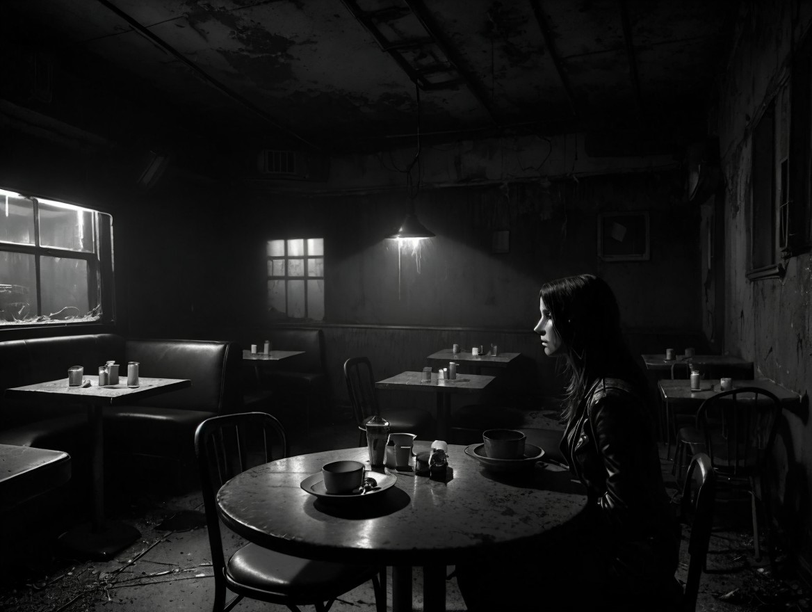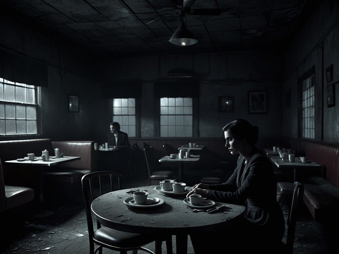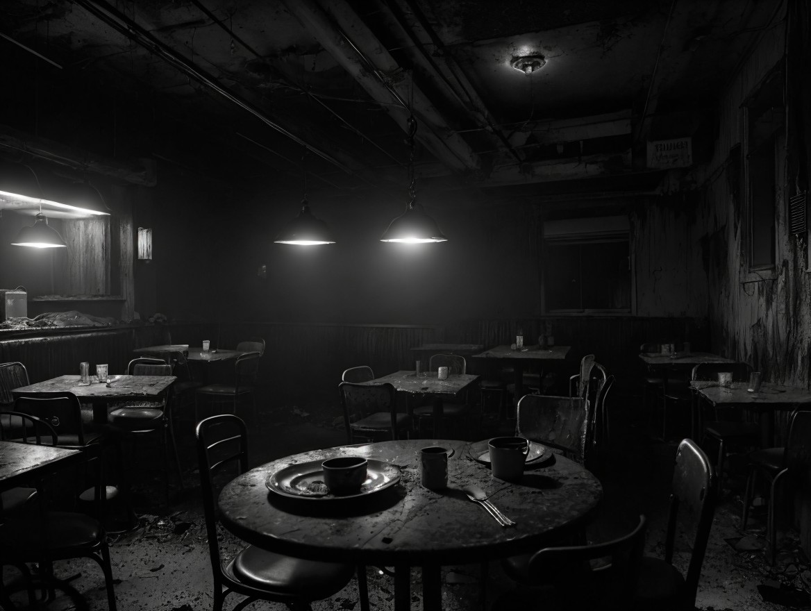Prompt: "Dimly lit experimental ambient scene, eerie and disturbing atmosphere, nocturnal setting, dense with shadows, ominous mood, presence of a woman and a man, abandoned restaurant or diner, scattered food plates, dusty tables, cobwebs in corners, hauntingly beautiful, mysterious narrative, subtle hints of decay, cinematic lighting, deep shadows and highlights, textured surfaces, focus on details like cracked walls and worn-out furniture, rich color palette with deep blues, purples, and muted greens, digital artistry, surreal and unsettling, by Zdzisław Beksiński and H.R. Giger, ArtStation."