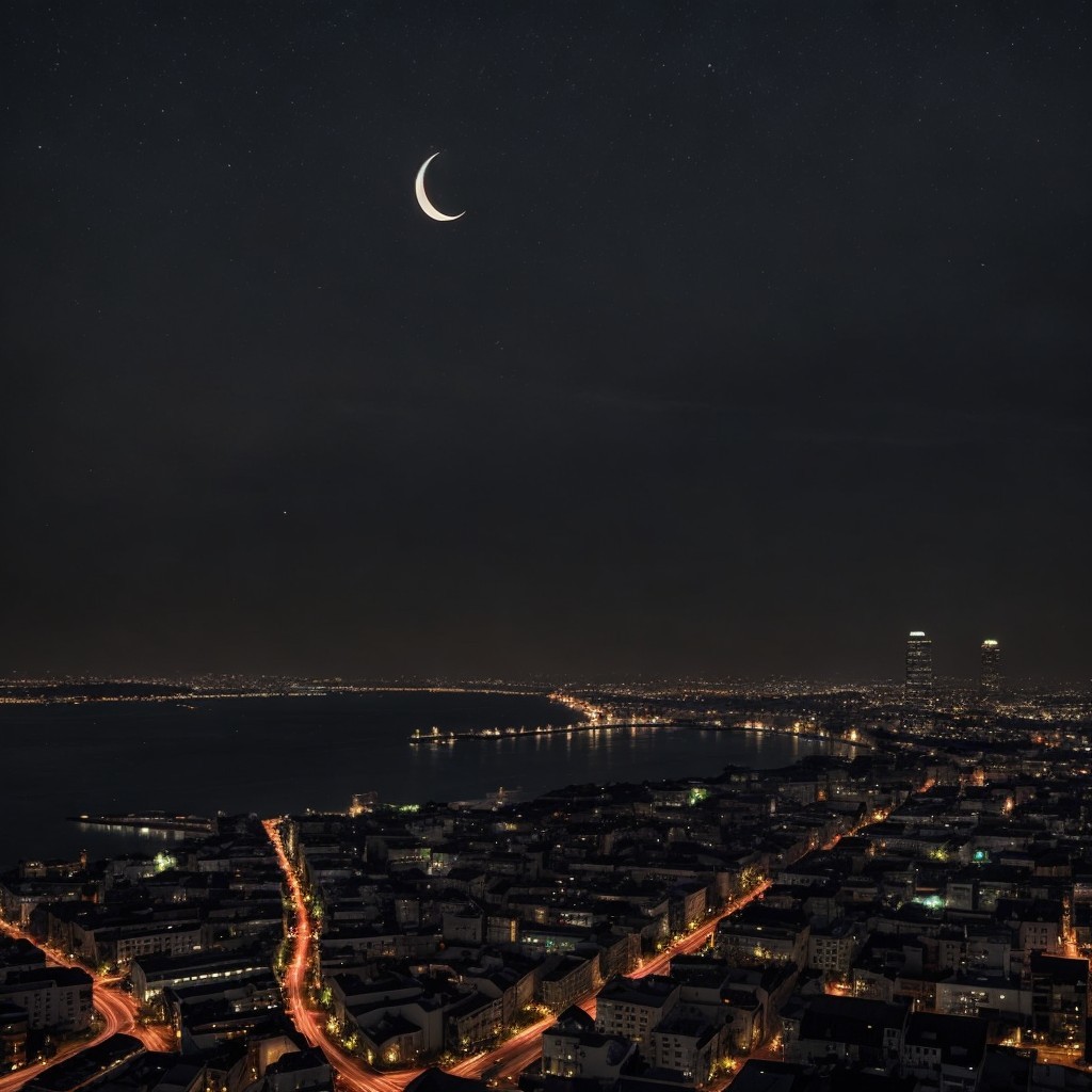 A nocturnal cityscape with a crescent moon and starry sky above a coastal city with lit streets and a bridge crossing the water.