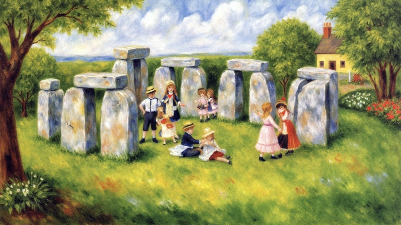 A whimsical scene near Stonehenge features children playing among the ancient stones, dressed in vintage clothing, with a quaint house and lush greenery in the background.