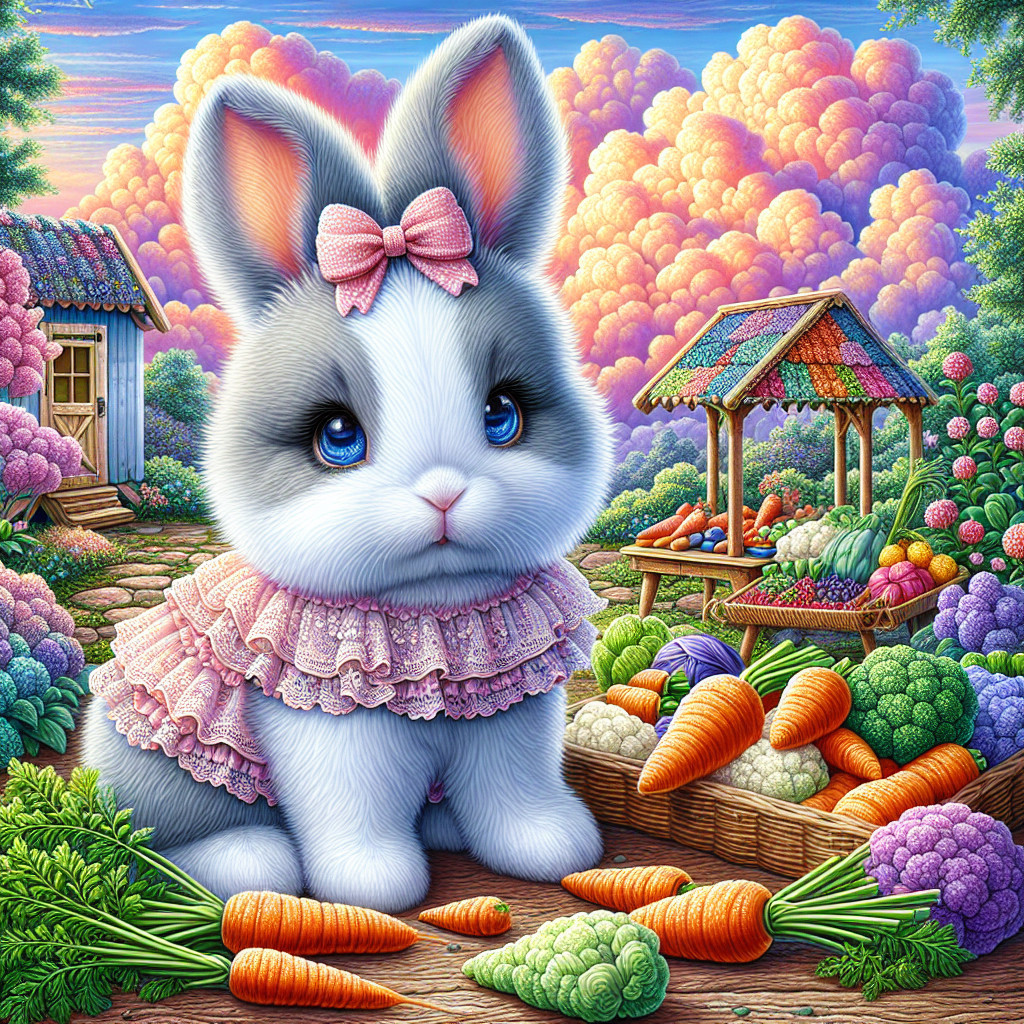 A fluffy white bunny with big eyes, wearing a pink dress and bow, sits among vibrant vegetables in a sunny garden. Colorful flowers bloom in the background, creating a cheerful scene.