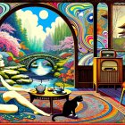 Woman in Colorful Psychedelic Setting with Cat