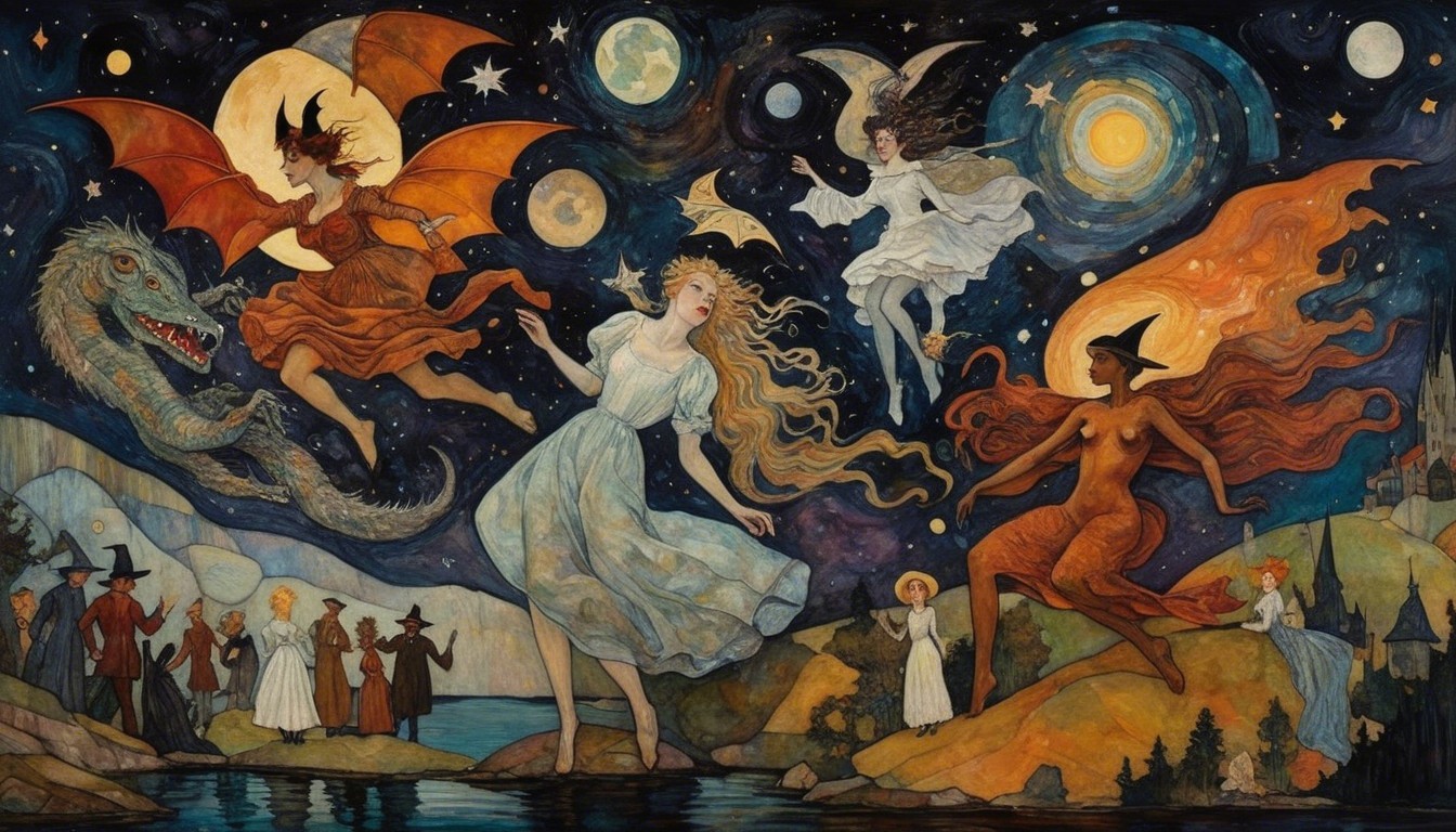 A whimsical painting with four women representing muses dancing under a starry sky, with onlookers, a crescent moon, and swirling celestial patterns.
