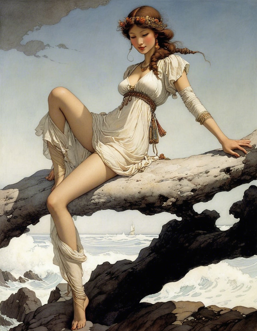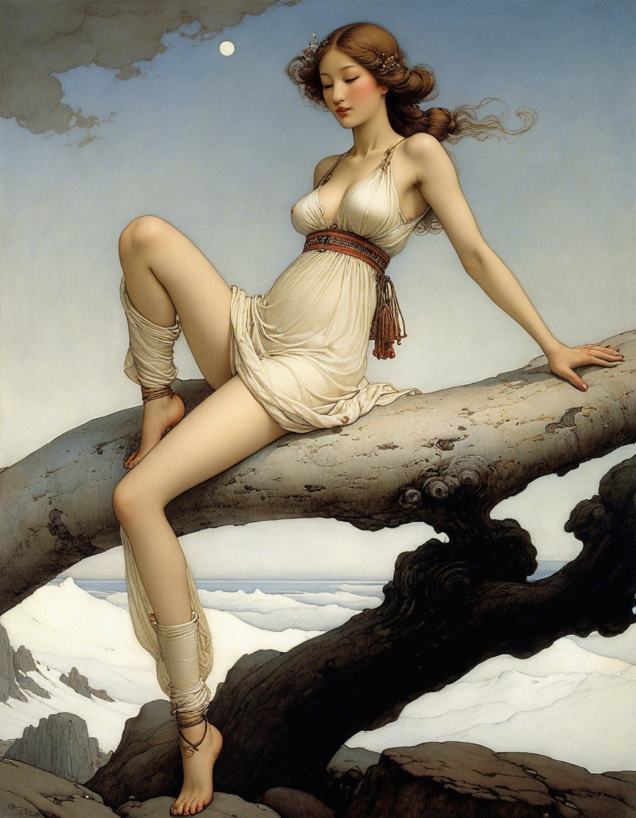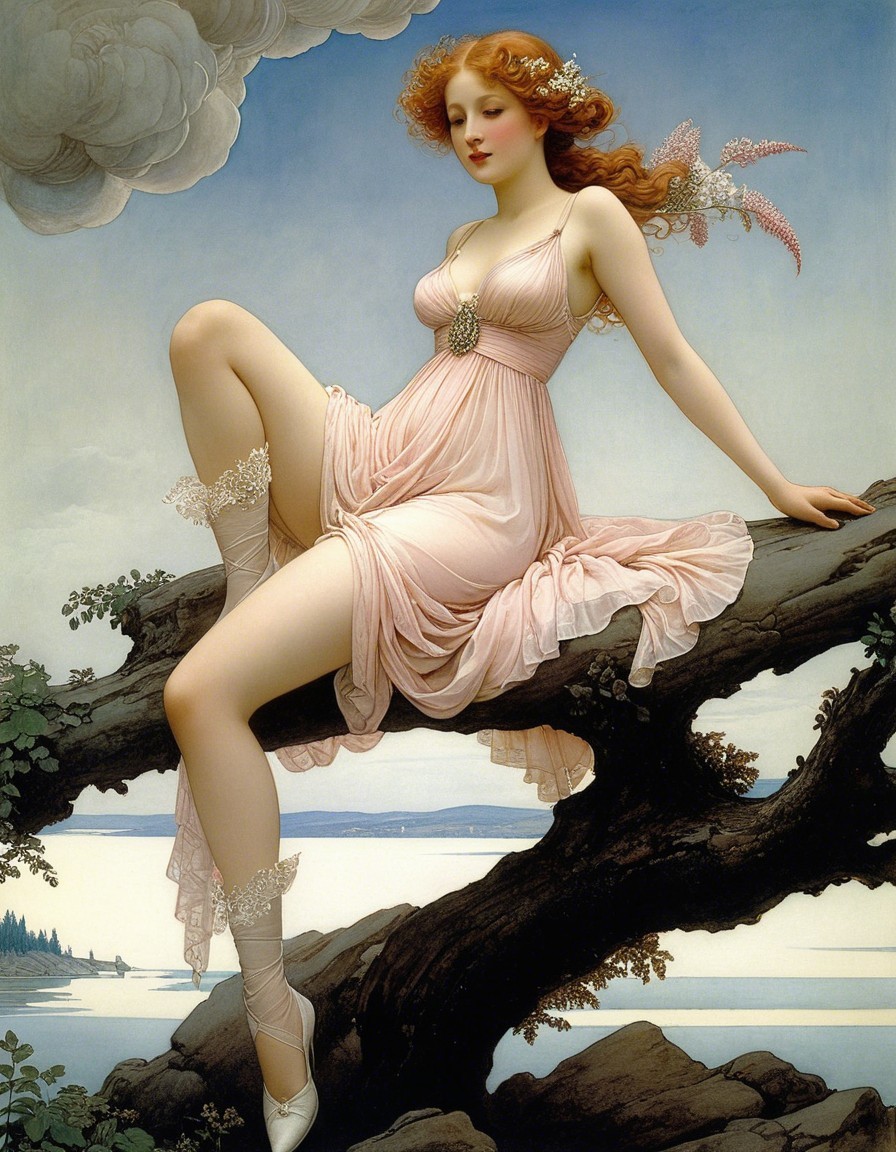 A serene figure draped in a flowing pink dress sits gracefully on a tree branch, holding a paintbrush. Her flowing hair and floral crown evoke a sense of beauty and creativity in a lush landscape.