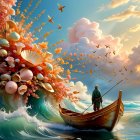 A serene scene depicts a small wooden boat navigating vibrant, swirling waters. Lush, colorful clouds and a large, detailed flower add to the dreamlike, whimsical atmosphere of the landscape.