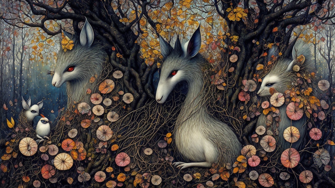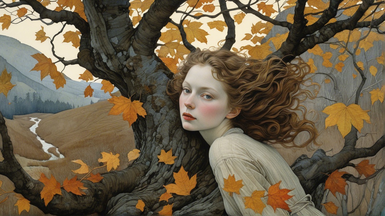 A woman with flowing red hair gazes softly amidst a backdrop of a gnarled tree and vibrant orange leaves, evoking a dreamy autumn atmosphere and a sense of serene beauty.