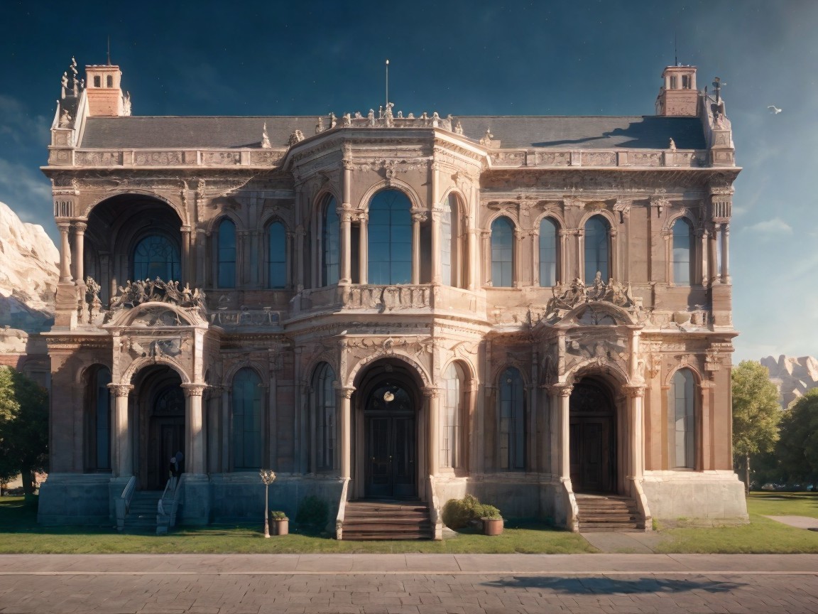 A majestic historic building with intricate architecture, featuring tall spires and ornate details. A cyclist passes by, highlighting the serene ambiance of the scene under a clear sky.