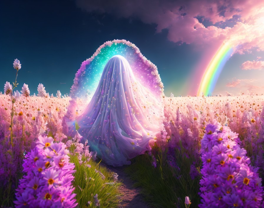 A fantastical figure with a glowing, rainbow-hued aura stands amidst a vibrant field of pink flowers under a rainbow sky.
