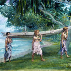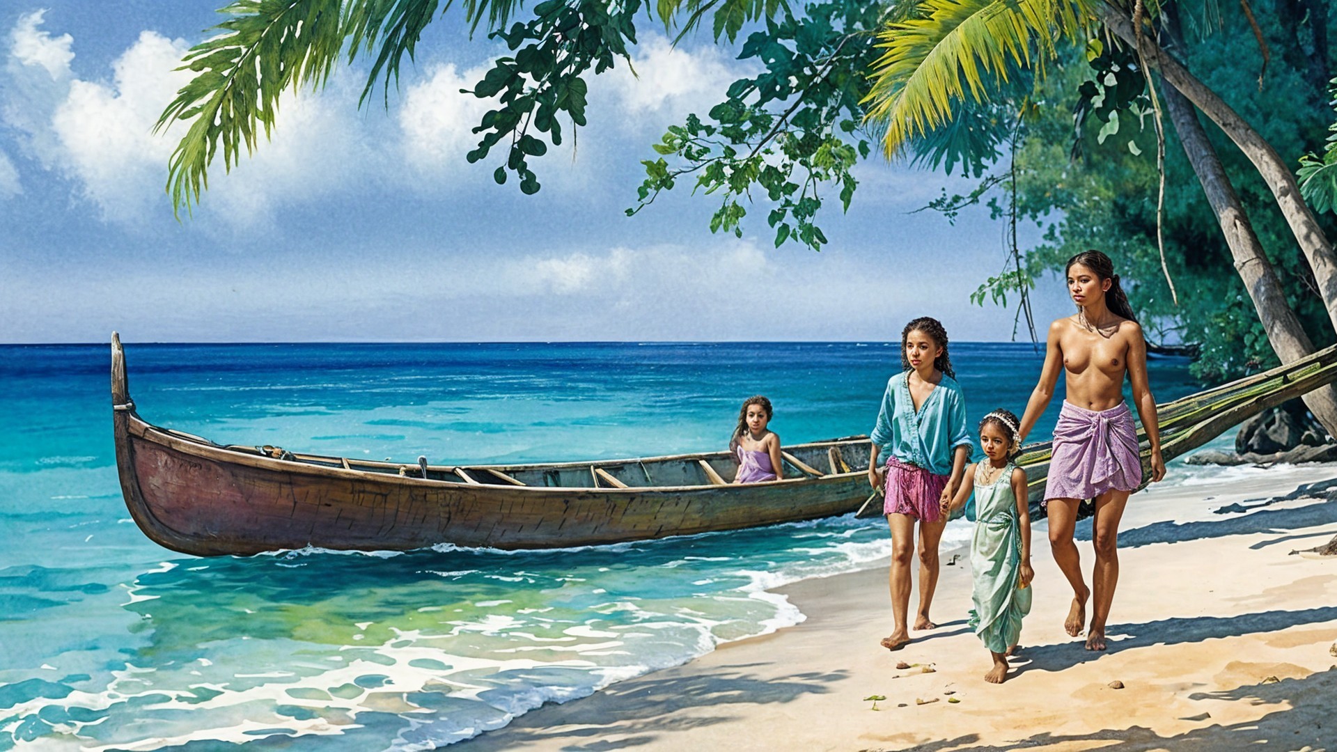 A woman walks hand-in-hand with three young girls along a sandy beach, with lush palm trees and a calm ocean in the background. A boat floats nearby under a cloudy, blue sky.