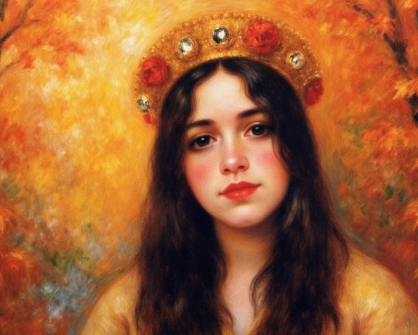 The artwork features two elegantly poised women with rich auburn hair, wearing deep purple outfits. A mysterious green figure with leaf-like features looms behind them, holding an ornate sphere.