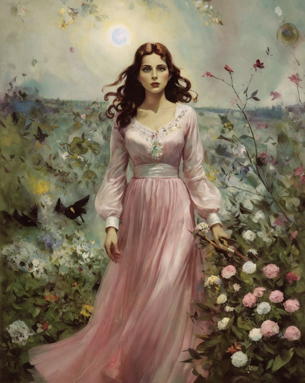 A woman in a pink dress stands amid flowers with birds flying around, under a hazy sun near a coastal village.