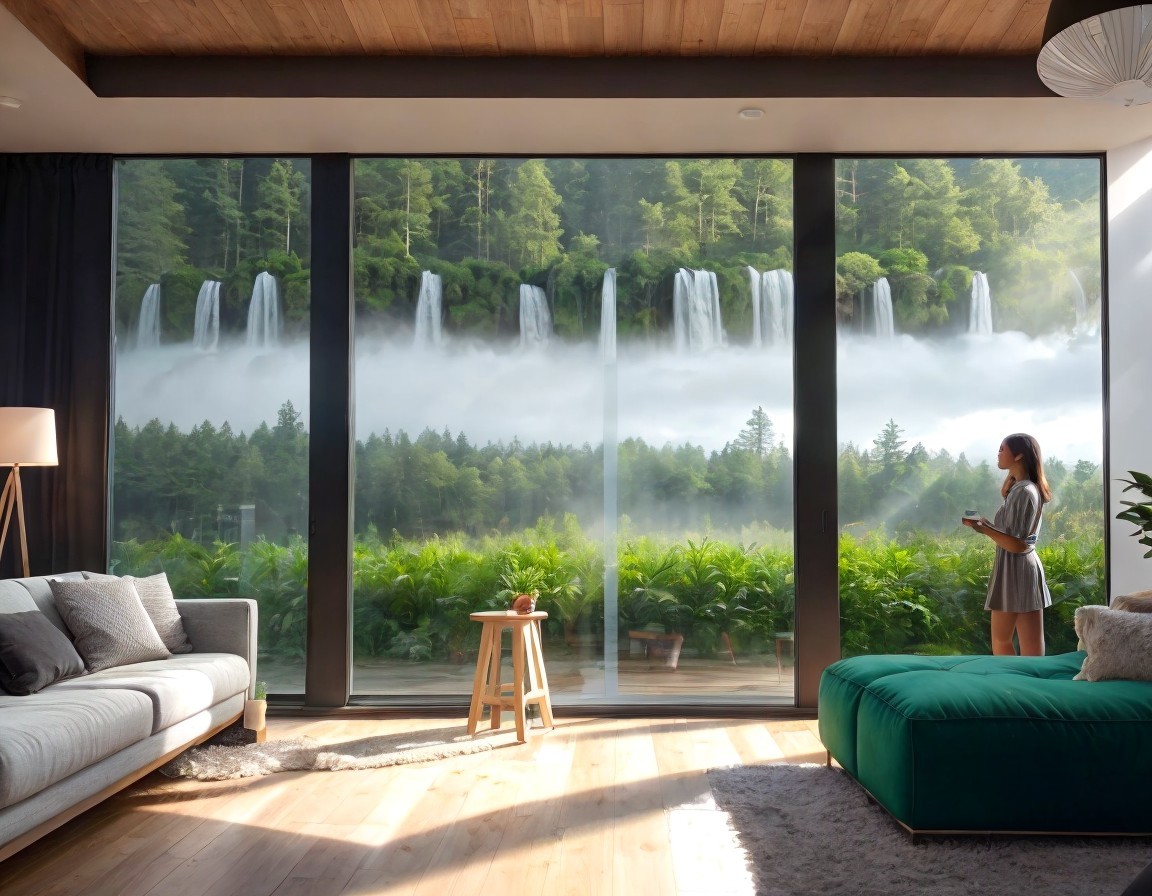A modern living room with large windows offering a stunning view of a cascading waterfall amidst lush greenery.