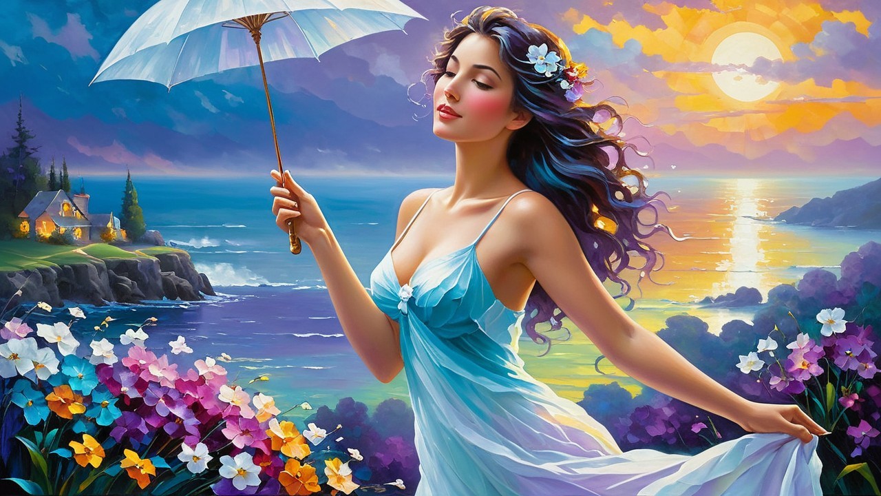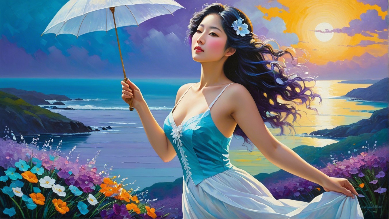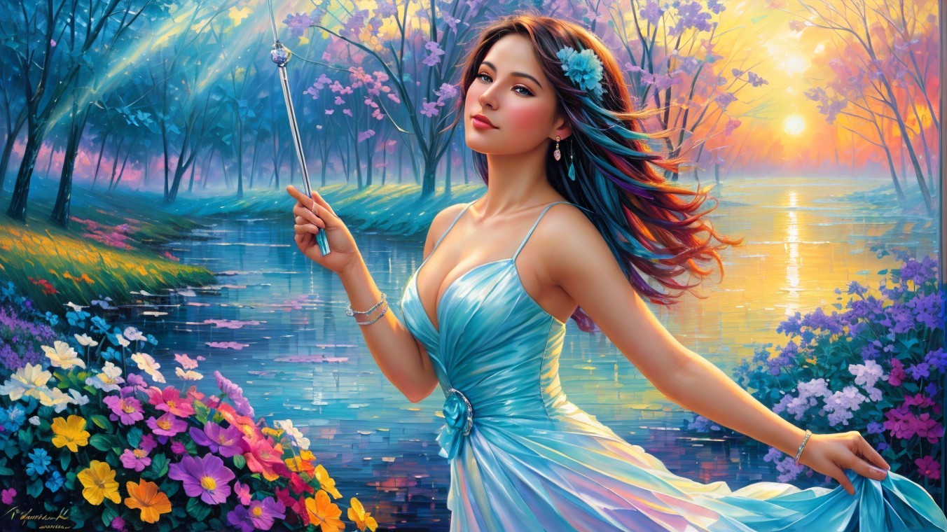 A vibrant landscape filled with large white flowers and colorful blossoms amidst a dreamy, misty backdrop of softly blurred trees and warm, pastel hues in the sky.