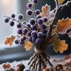 A rustic arrangement of frosted purple berries and vibrant autumn leaves sits on a wooden table, surrounded by natural elements like nuts and pine cones, creating a cozy, seasonal vibe.