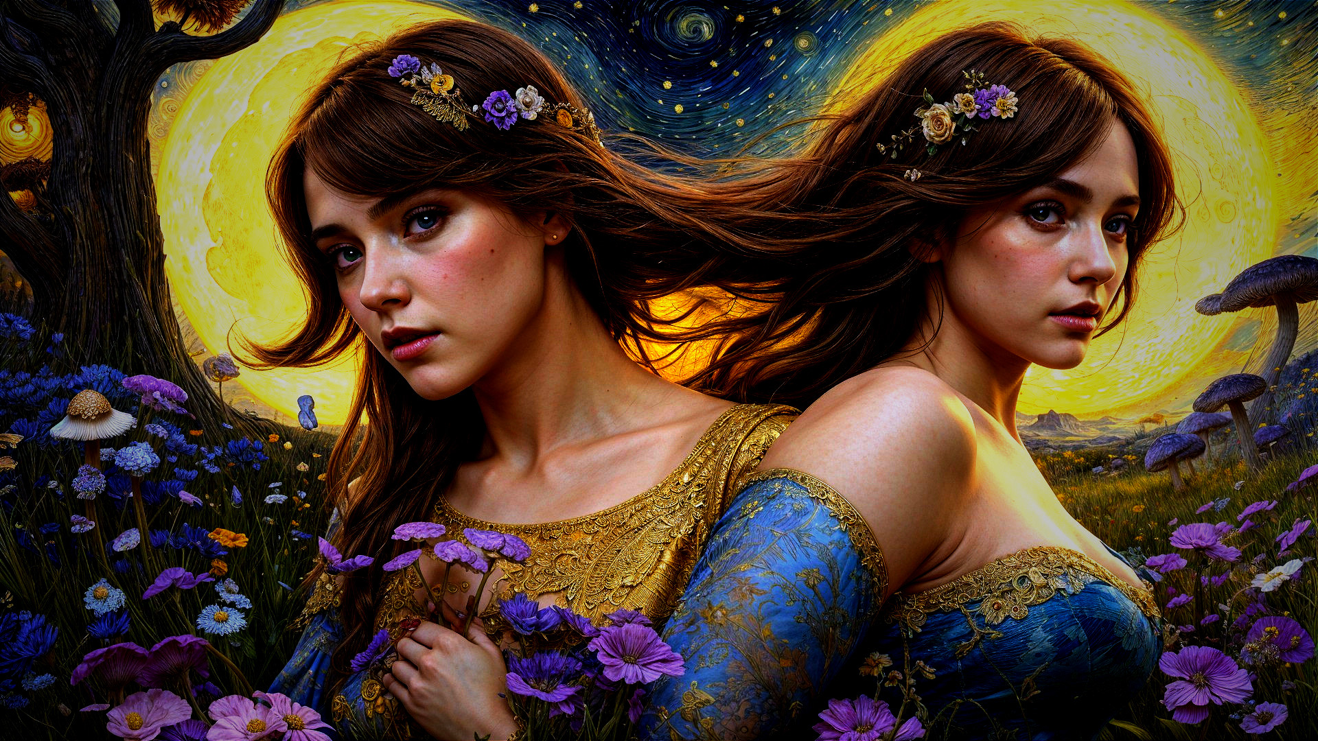 A stunning fantasy scene depicts a beautiful woman launching an attack on a city, surrounded by intricate monsters. The sunset casts a dramatic light, enhanced by vibrant colors and meticulous details.
