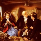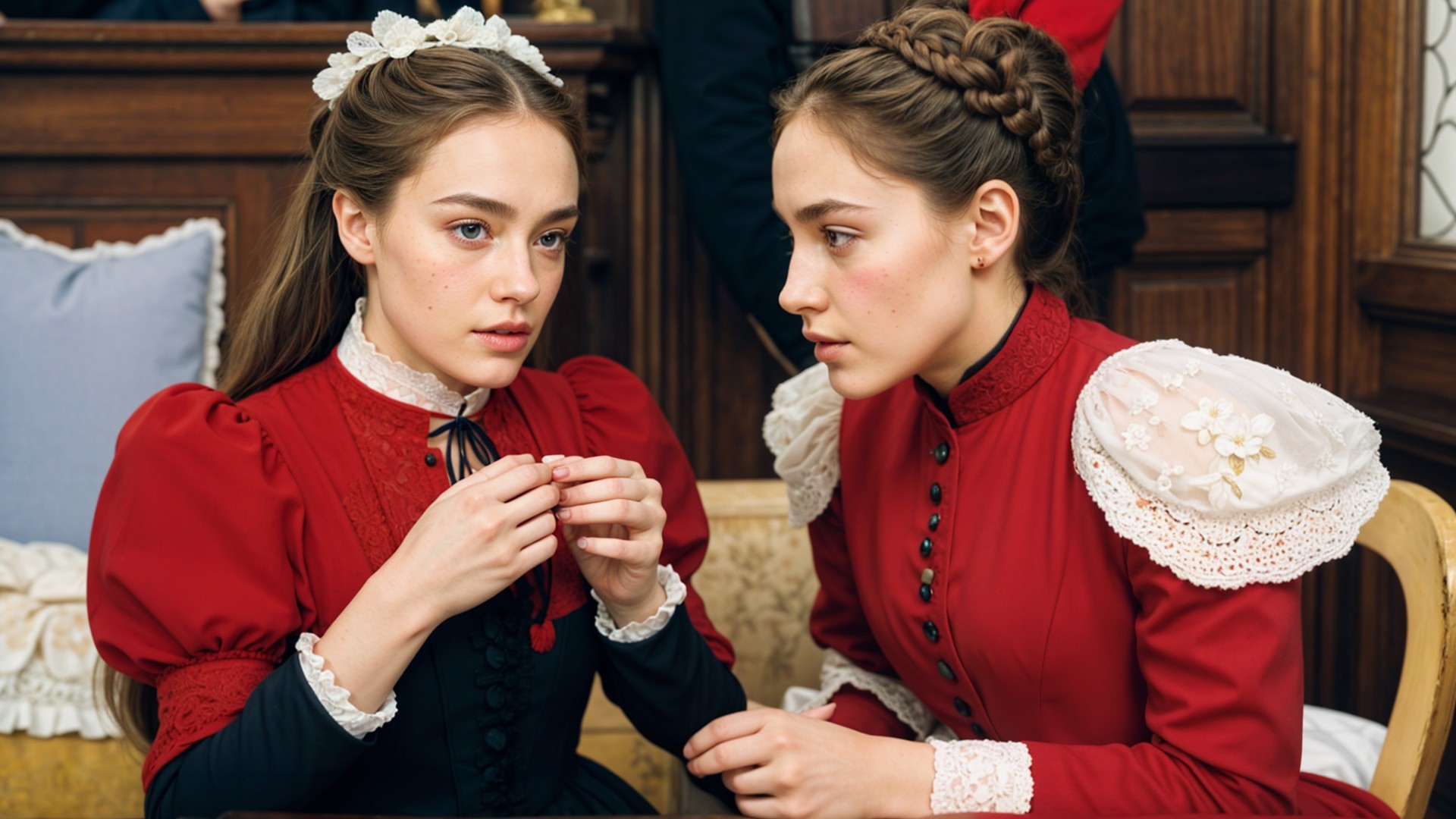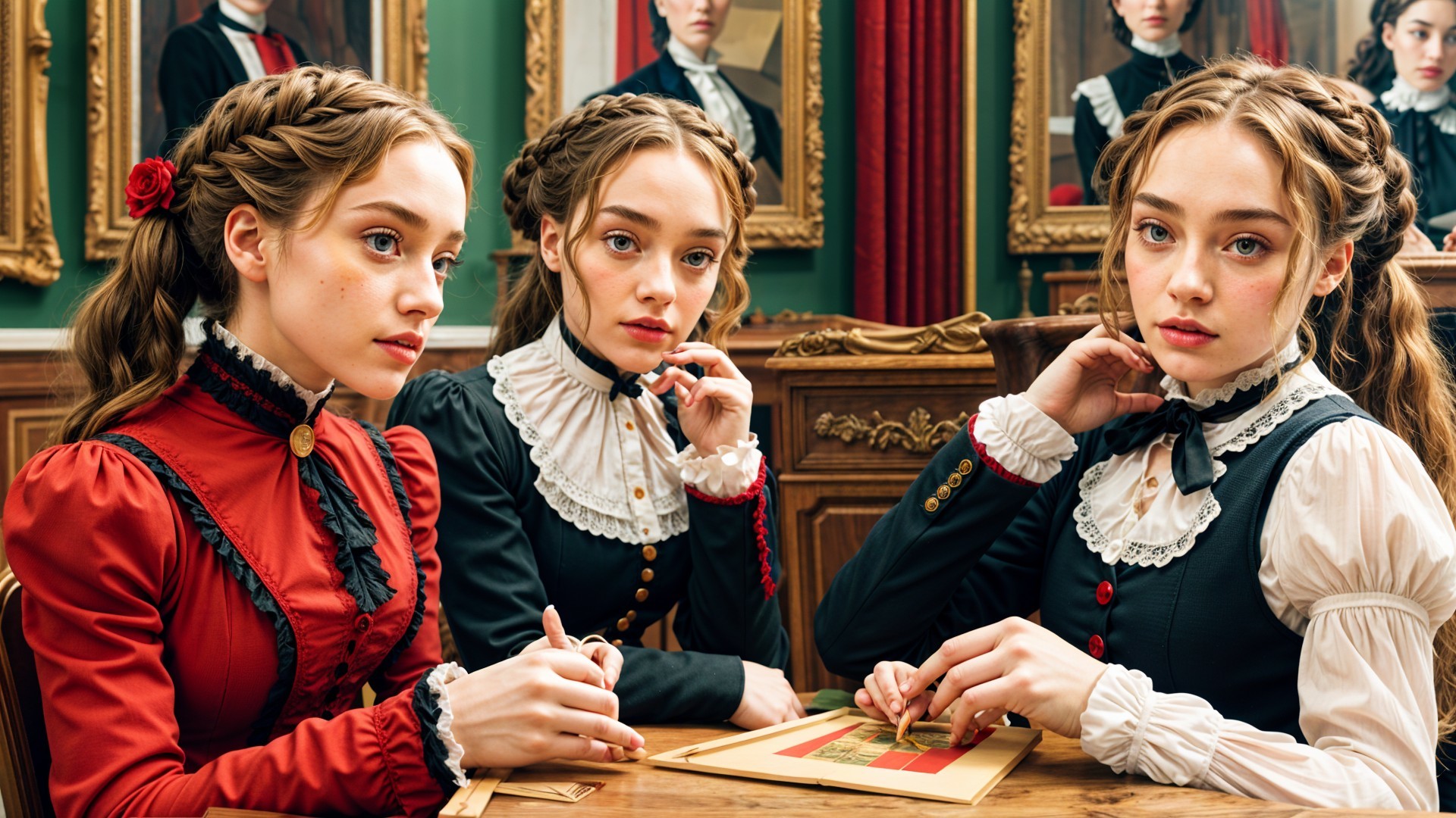 A young woman in Victorian attire sits at a table, drawing, surrounded by multiple reflections of herself in ornate frames. Each reflection showcases a different pose and expression.