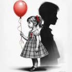 A young girl in a checkered dress holds a red balloon, her shadow revealing a more somber profile. The artwork contrasts innocence and a hint of darkness, evoking deep emotions.