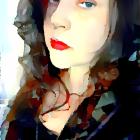 A captivating digital portrait featuring a woman with long, wavy hair and striking blue eyes. Her bold red lips stand out against a dark outfit, creating an intriguing and artistic composition.