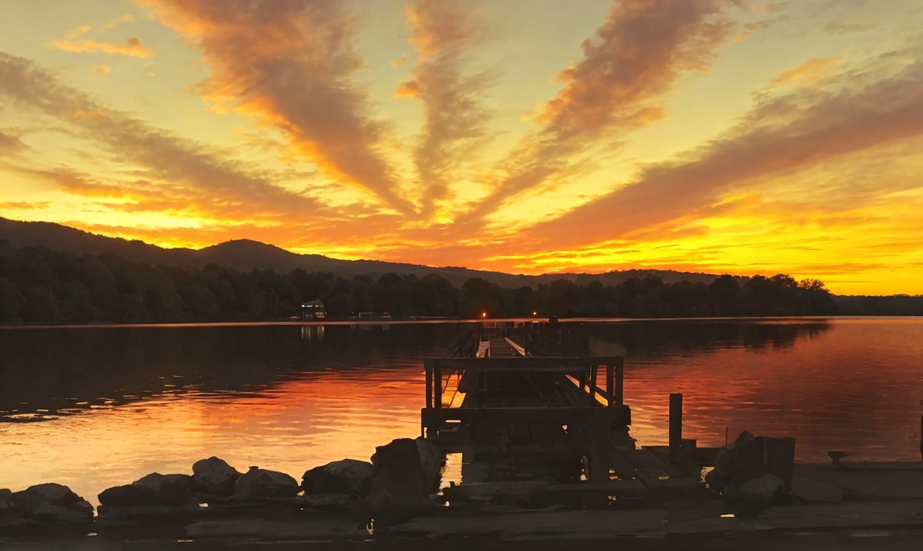 A serene sunset over a calm lake with a landing stage extending into the water and a vivid sky reflecting warm hues above a tree-lined shore.