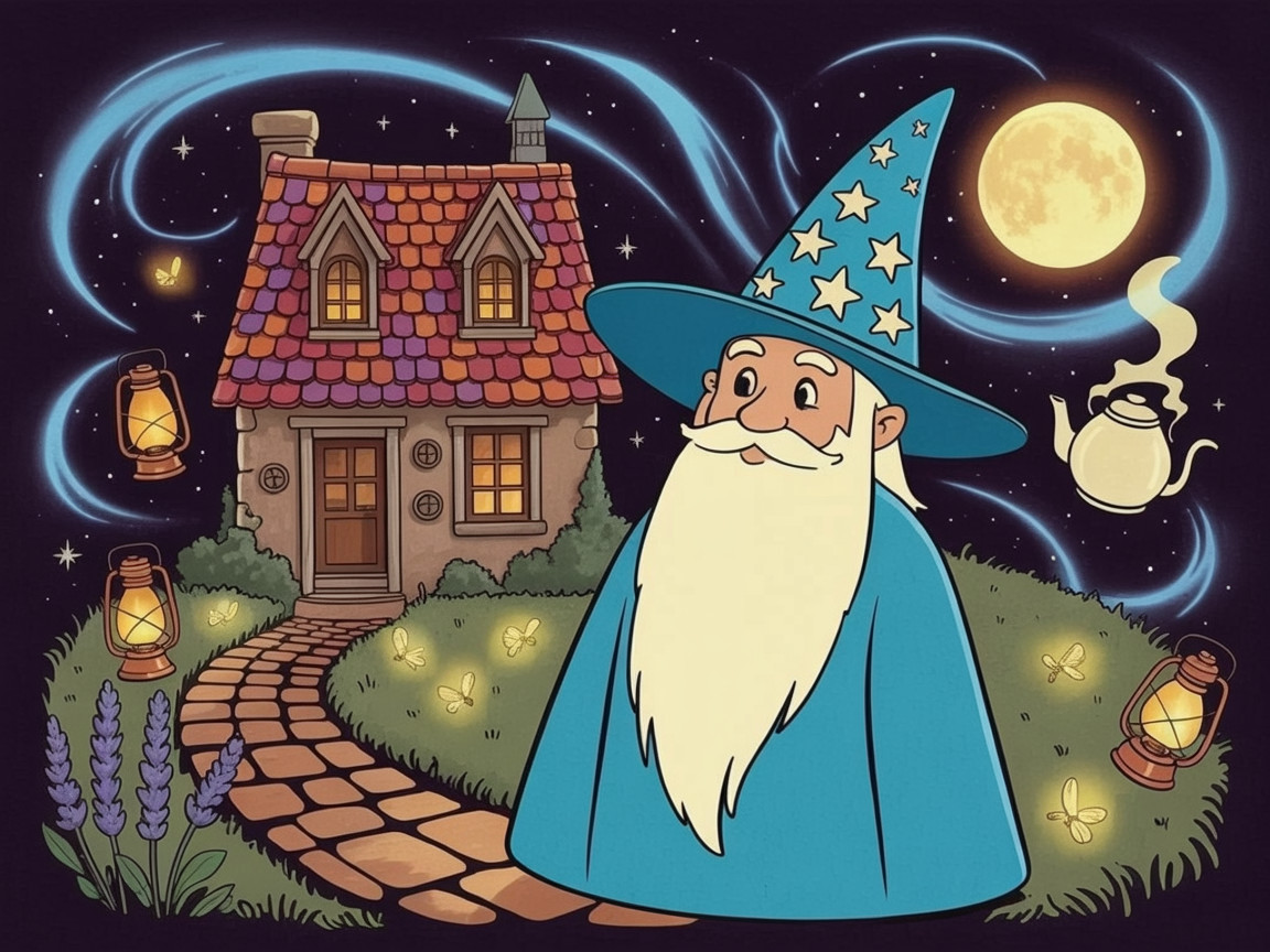 A whimsical fantasy scene featuring a cheerful wizard with a long white beard, wearing a blue robe and pointed hat, standing in front of a charming stone cottage. The cottage has a colorful tiled roof, glowing windows, and is surrounded by lush greenery. In the background, a full moon illuminates a vibrant sky filled with swirling clouds. Magical elements include a floating teapot and lanterns, enhancing the enchanting atmosphere of this fairy-tale setting.