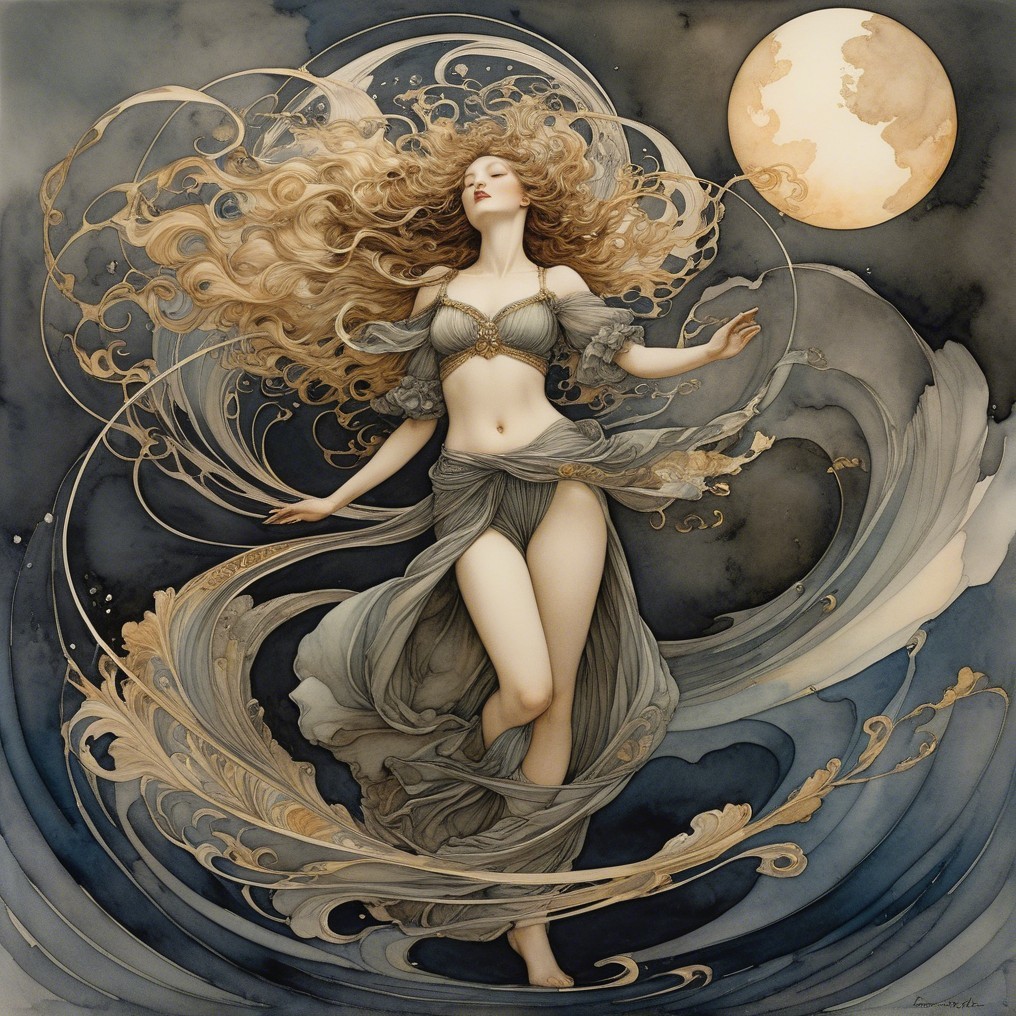 A graceful woman with flowing hair dances among celestial swirls. She wears a delicate outfit, embodying a dreamy connection to the night sky and the glowing moon, creating a mystical atmosphere.