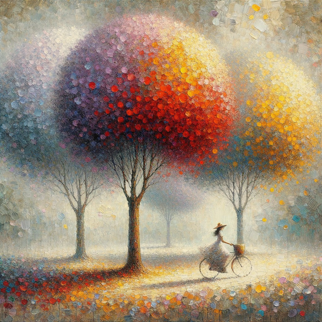 Whimsical colourful landscape with a female figure on a bicycle surrounded by bright rounded trees.
