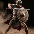 A fierce warrior in ancient armor wields a sword and shield, adorned with intricate designs. He stands in a dynamic pose, ready for battle against a backdrop of dust and darkness. (The base image was created with Raphael app)