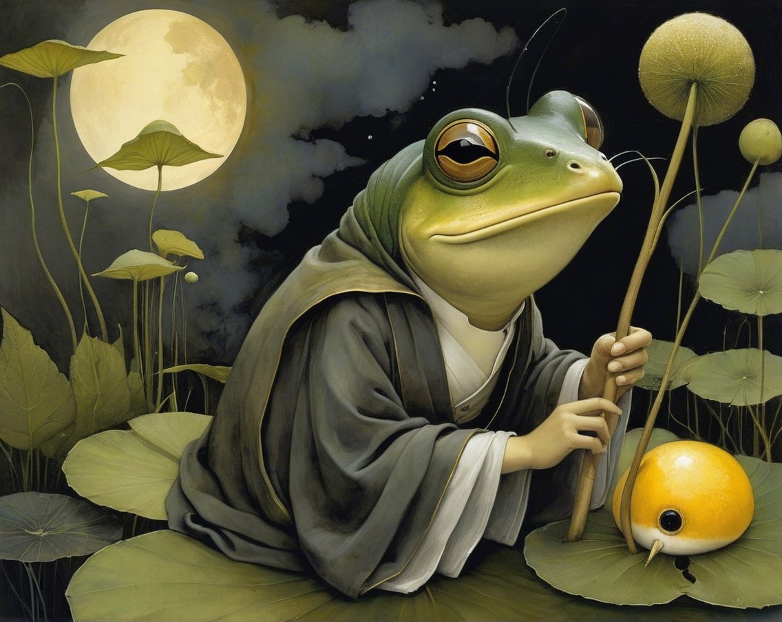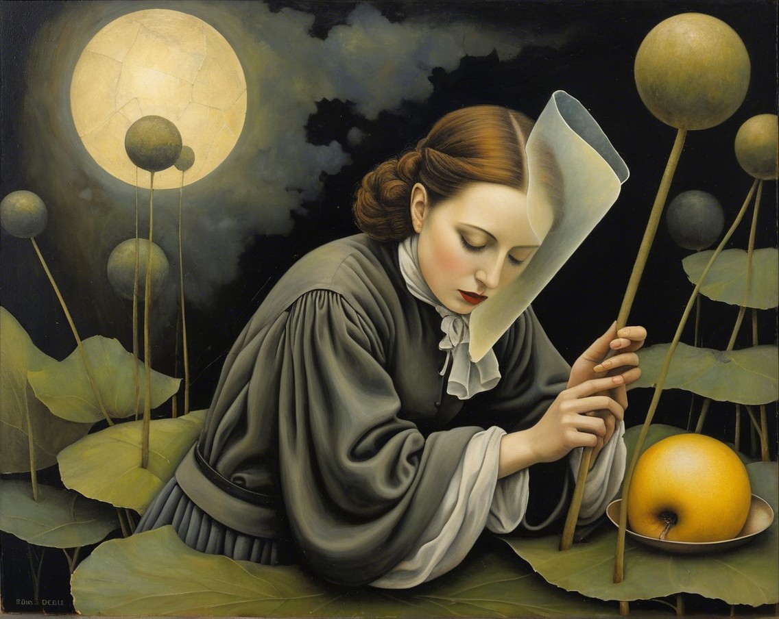 A serene woman sits in a field of yellow flowers, holding a spherical object. The moon glows in a dark sky above, while distant houses are visible along a tranquil waterway.