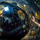A young woman in a black polka dot dress gazes at a reflective orb adorned with gold accents. The background features a cloudy sky and hints of greenery, creating a dreamy atmosphere.