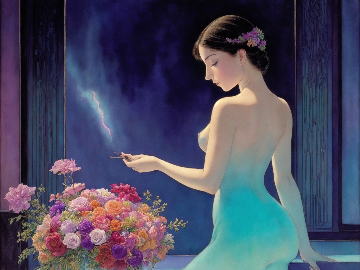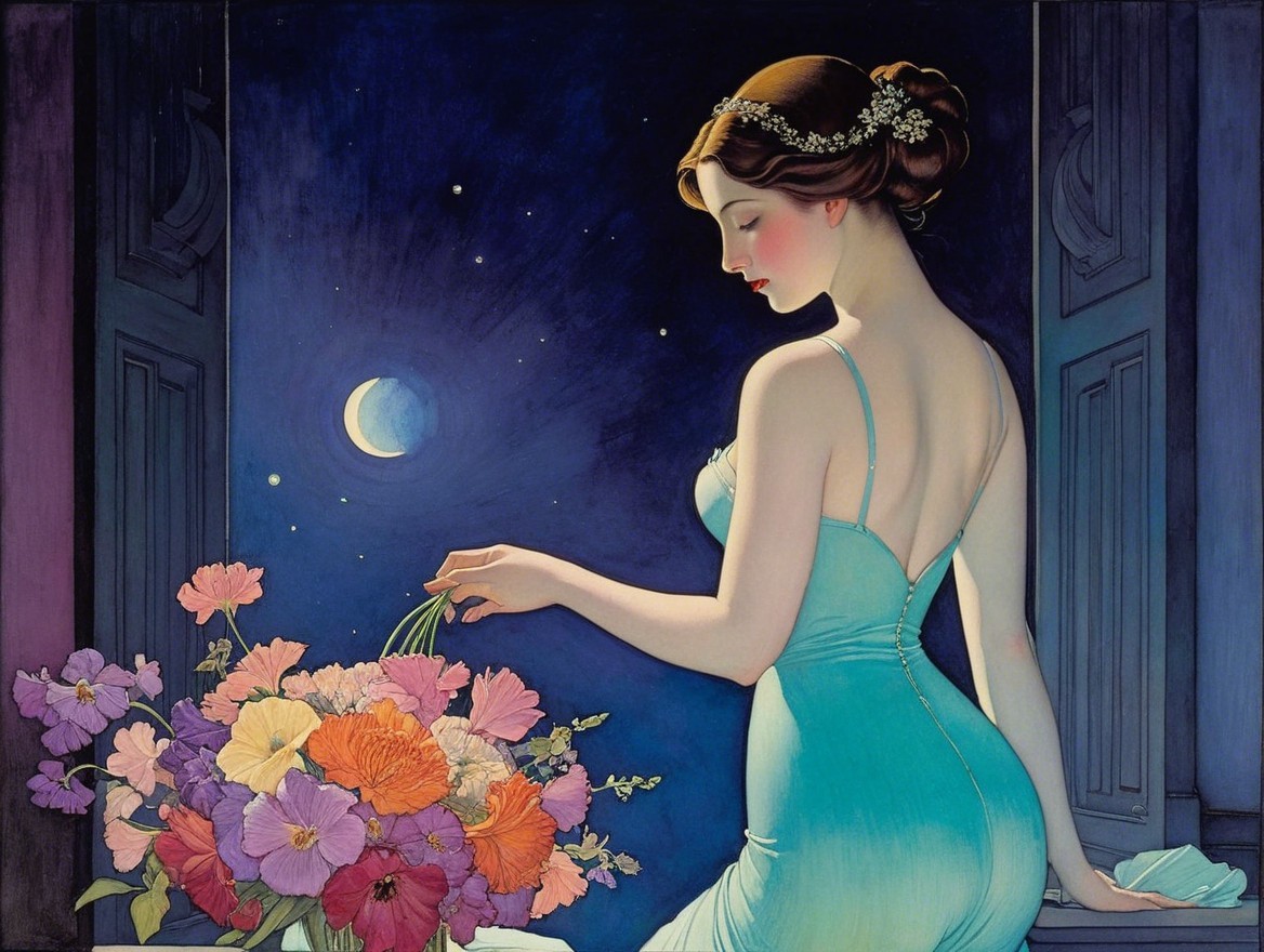 A serene woman in a blue gown leans gracefully from a window, arranging vibrant flowers. The moonlight bathes the scene in soft light, creating a tranquil atmosphere.