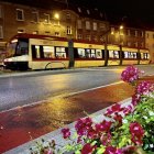 A sleek tram glides along a rain-slicked street, illuminated by warm lights from elegant buildings. Vibrant flowers line the path, creating a picturesque evening scene.